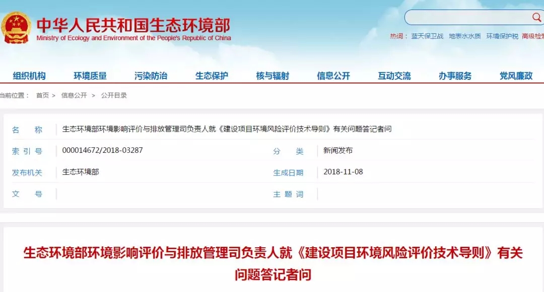 生態(tài)環(huán)境部日前印發(fā)了《建設(shè)項(xiàng)目環(huán)境風(fēng)險(xiǎn)評價(jià)技術(shù)導(dǎo)則》(HJ169-2018)(以下簡稱《風(fēng)險(xiǎn)導(dǎo)則》),生態(tài)環(huán)境部環(huán)境影響評價(jià)與排放管理司負(fù)責(zé)人就《風(fēng)險(xiǎn)導(dǎo)則》修訂的背景、思路及內(nèi)容等有關(guān)問題回答了記者的提問。